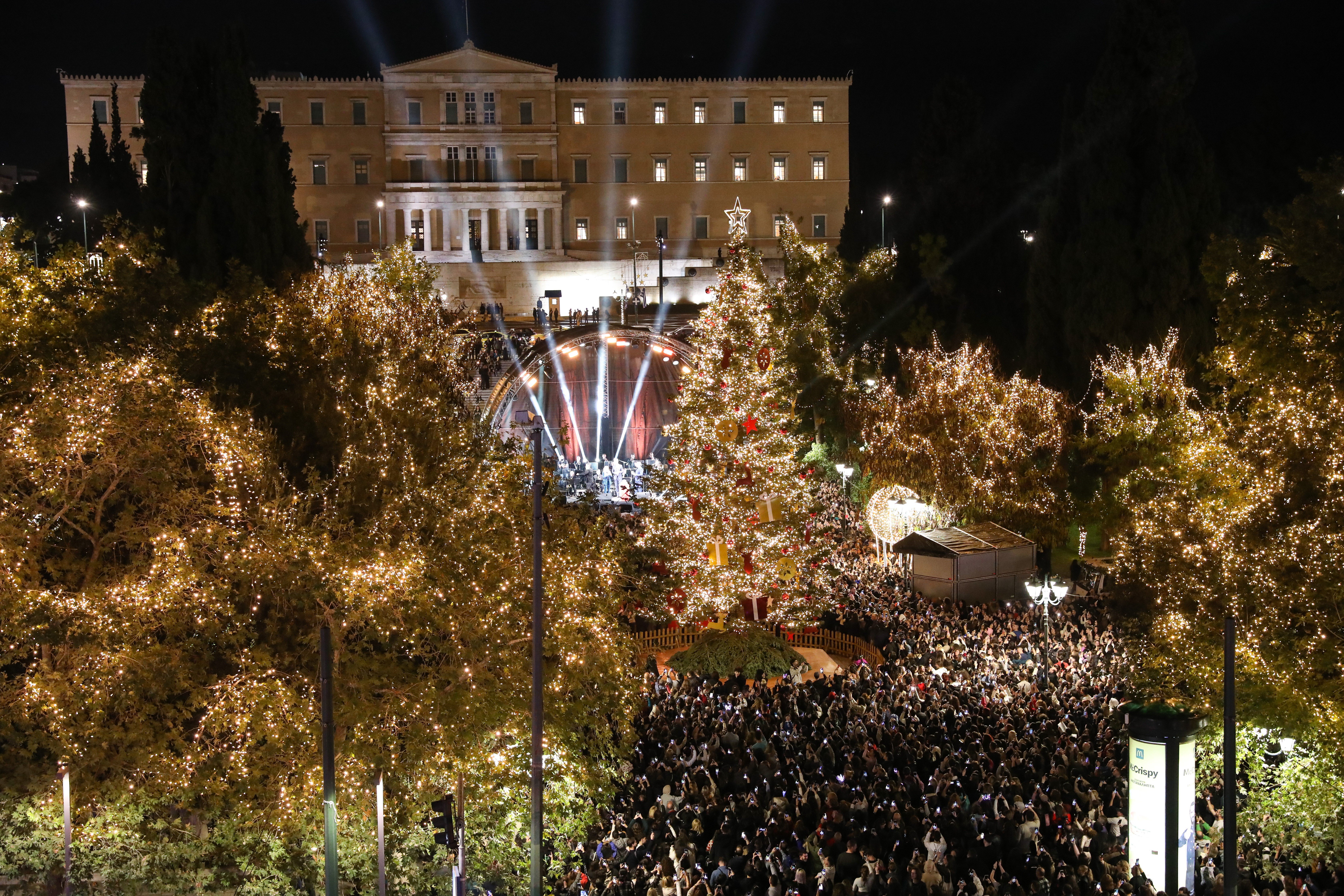 Ο κόσμος παρακολουθεί τον φωτισμό του χριστουγεννιάτικου δέντρου στην πλατεία Συντάγματος στην Αθήνα.