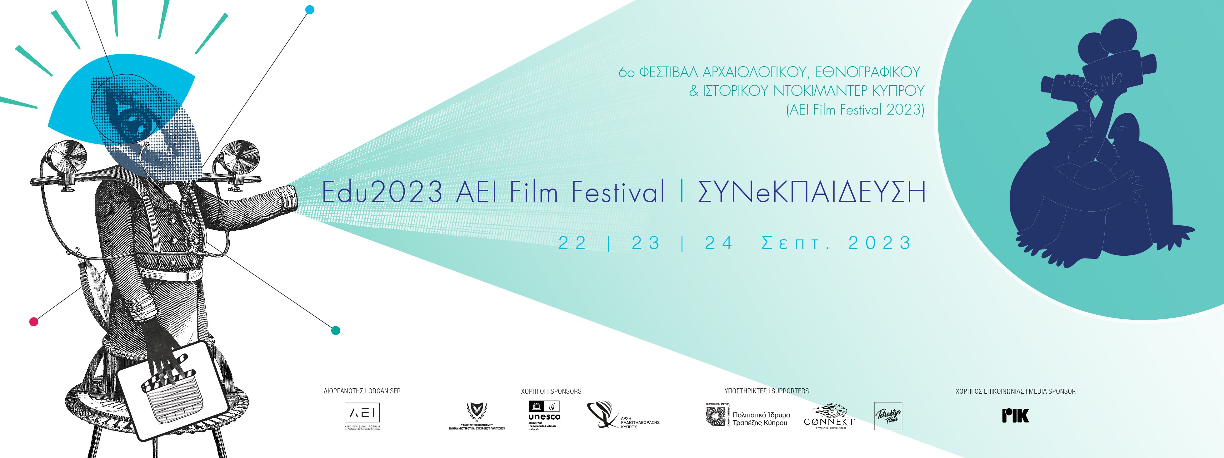 Για περισσότερες πληροφορίες για το πρόγραμμα του Εκπαιδευτικού Τμήματος του φετινού ΑΕΙ Film Festival: "Edu2023 AEI Film Festival | ΣΥΝeΚΠΑΙΔΕΥΣΗ" και δηλώσεις συμμετοχής στη Μαθητική Ημερίδα και στα Βιωματικά Εργαστήρια επικοινωνήστε με τον καλλιτεχνικό διευθυντή του Φεστιβάλ, Σταύρο Παπαγεωργίου, συντονιστή του Φεστιβάλ ΑΕΙ και των εκπαιδευτικών εργαστηρίων ΣΥΝeΚΠΑΙΔΕΥΣΗ, στο aei.filmfestival@cytanet.com.cy, στο τηλέφωνο 99694407 και στην ιστοσελίδα www.aei-filmfestival.org