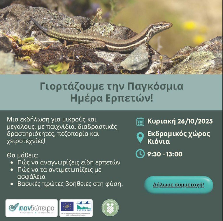 Το Ανοικτό Πανεπιστήμιο Κύπρου, σε συνεργασία με το Terra Cypria και τον Ερπετολογικό Σύνδεσμο Κύπρου γιορτάζουν την Παγκόσμια Ημέρα Ερπετών με μια μοναδική εμπειρία στη φύση! Η εκδήλωση θα γίνει την Κυριακή 26 Οκτωβρίου στον εκδρομικό χώρο Κιόνια (9:30 – 13:00) και θα περιλαμβάνει δραστηριότητες για μικρούς και μεγάλους.
