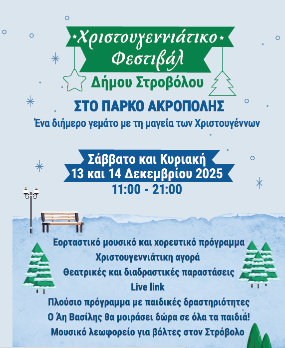 Ένα υπέροχο χριστουγεννιάτικο χωριό θα στηθεί στο μαγευτικό, καταπράσινο Πάρκο Ακρόπολης το Σαββατοκύριακο 13 και 14/12/25, για να φιλοξενήσει το Χριστουγεννιάτικο Φεστιβάλ του Δήμου Στροβόλου!