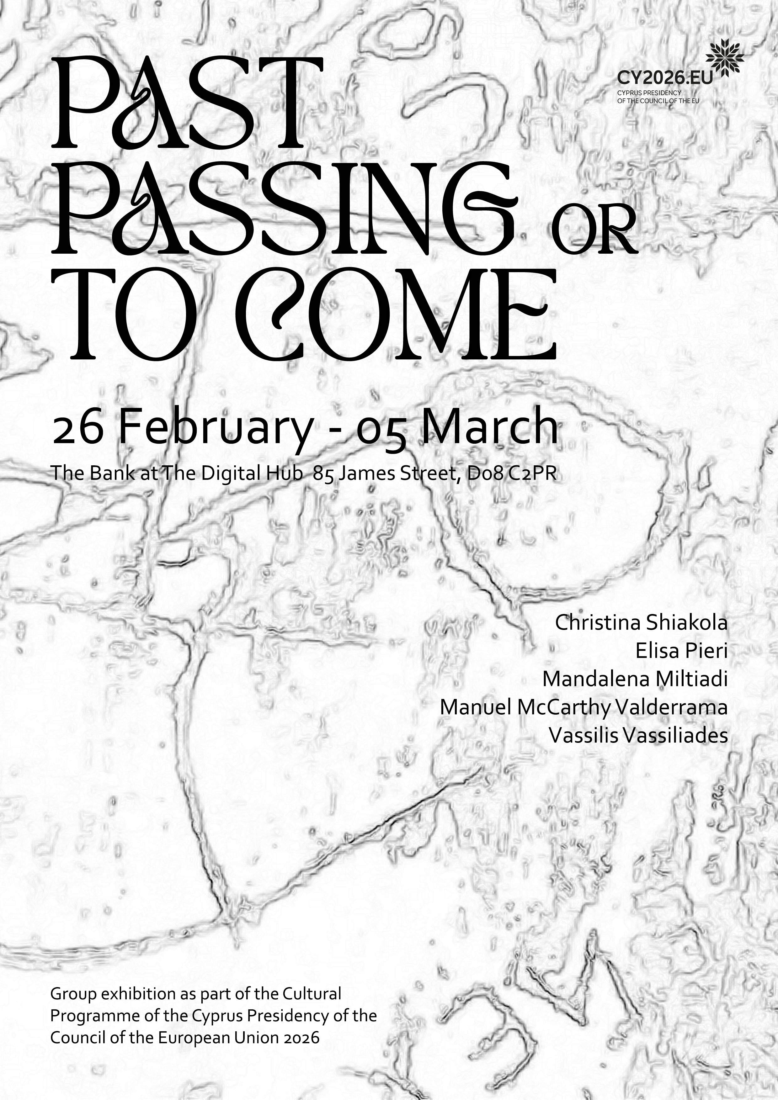 Η έκθεση Past, Passing or to Come, που θα παρουσιαστεί στο Δουβλίνο από τις 26/2 μέχρι τις 5/3, είναι μια πρωτοβουλία του καλλιτεχνικού, μη κερδοσκοπικού οργανισμού SIMIO5 και αποτελεί μέρος των δράσεων που προωθούνται από το Υφυπουργείο Πολιτισμού σε συνεργασία με Πρεσβείες της Κυπριακής Δημοκρατίας στο εξωτερικό στο πλαίσιο των εκδηλώσεων για την ανάληψη της Προεδρίας του Συμβουλίου της Ευρωπαϊκής Ένωσης από την Κυπριακή Δημοκρατία. Είναι χορηγημένη από το Υφυπουργείο Πολιτισμού και στηρίζεται από την Πρεσβεία της Κυπριακής Δημοκρατίας στην Ιρλανδία.